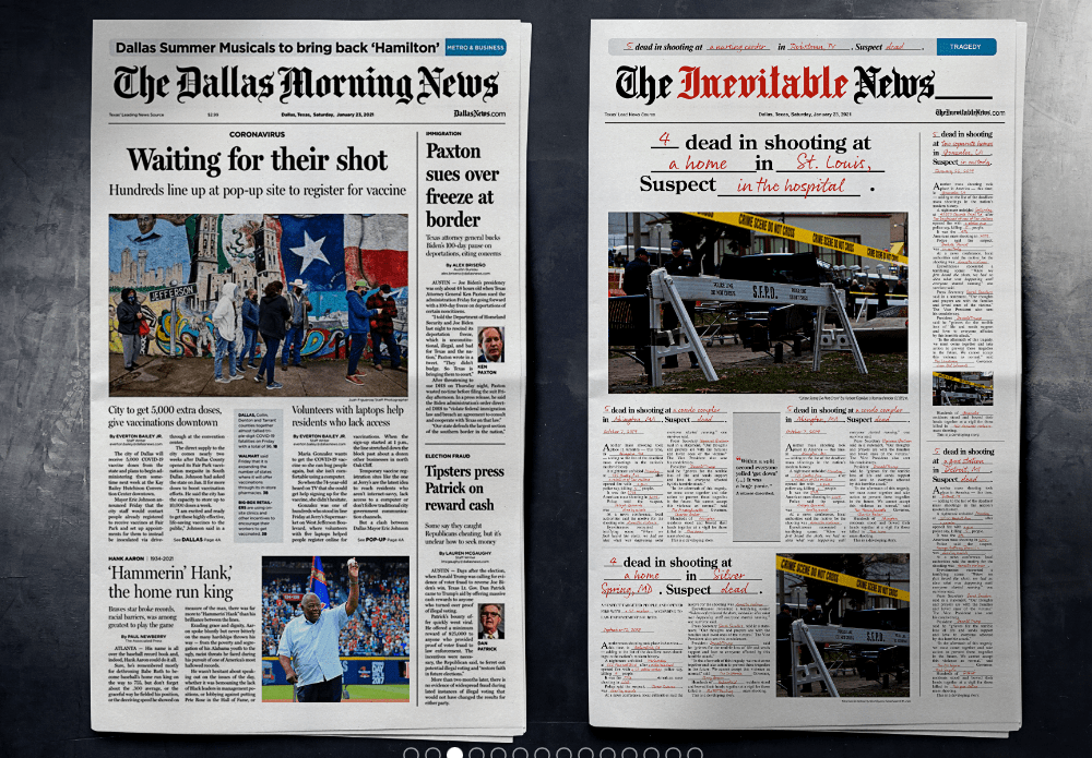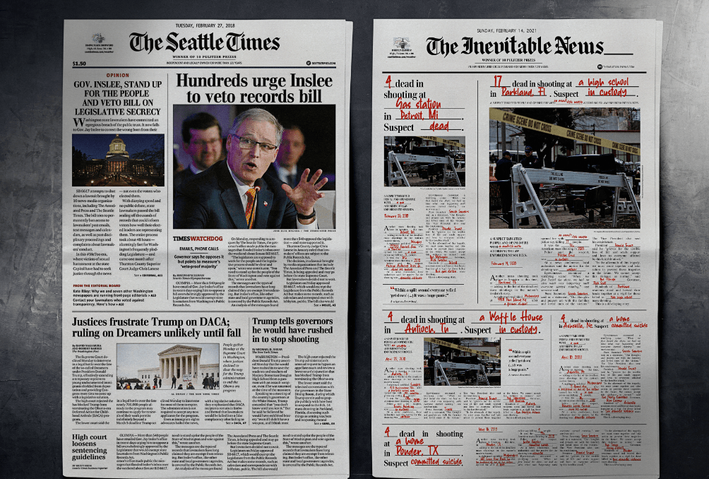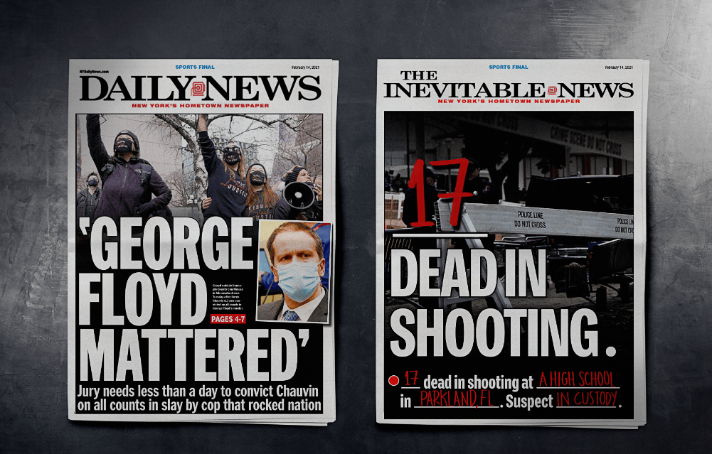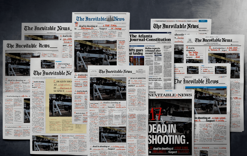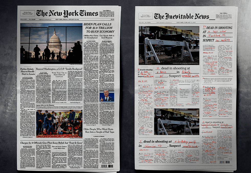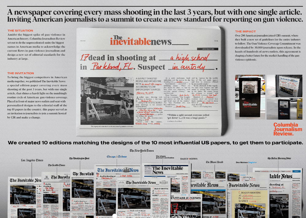 Cada día mueren 100 personas por disparos de arma en Estados Unidos. Los periódicos reflejan estás noticias de una manera cotidiana. Para mostrar esta triste realidad, AREA 23, AN IPG HEALTH COMPANY / New York creo para su cliente The Columbian Journalism review un nuevo formato. Una noticia sobre muertes de personas dónde se dejaba en blanco para rellenar cada día solo algunas palabras como el número de muertes, dónde ocurrió … Se inserto en los 10 principales periódicos del país, imitando la tipografía y layout de cada uno de ellos. Con el concepto de «Las noticias inevitables», quería dar la voz de alarma sobre la cantidad enorme de asesinatos y muertes en el país.